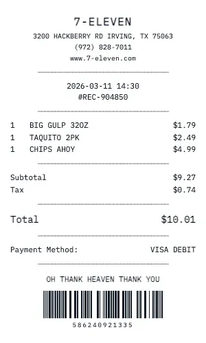 Whether you need a 7-Eleven receipt for a warranty claim, return authorization, price adjustment, or expense documentation, our generator creates receipts that look exactly like the real thing. Customize store number, register number, transaction ID, and barcode.