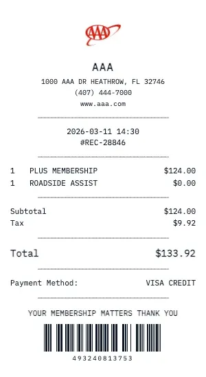 Whether you need a AAA receipt for a warranty claim, return authorization, price adjustment, or expense documentation, our generator creates receipts that look exactly like the real thing. Customize store number, register number, transaction ID, and barcode.