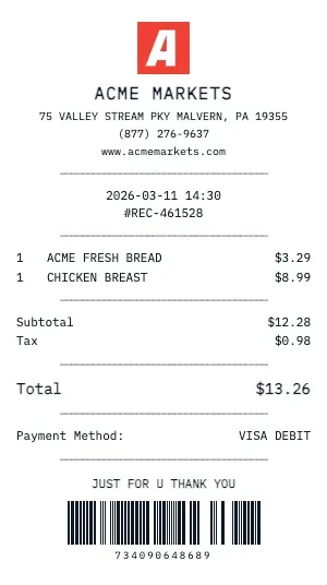 Generate a realistic Acme Markets grocery receipt with our free tool. Our grocery receipt format includes department codes, item SKUs, weight-based pricing for produce and deli, coupon discounts, loyalty card savings, and the classic "YOU SAVED $X.XX" summary line that real grocery receipts feature.