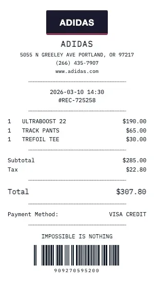 Whether you need a Adidas receipt for a warranty claim, return authorization, price adjustment, or expense documentation, our generator creates receipts that look exactly like the real thing. Customize store number, register number, transaction ID, and barcode.