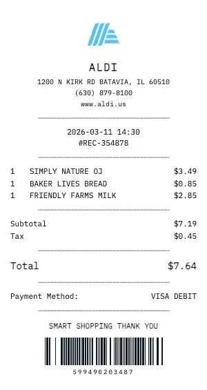 Generate a realistic Aldi grocery receipt with our free tool. Our grocery receipt format includes department codes, item SKUs, weight-based pricing for produce and deli, coupon discounts, loyalty card savings, and the classic "YOU SAVED $X.XX" summary line that real grocery receipts feature.