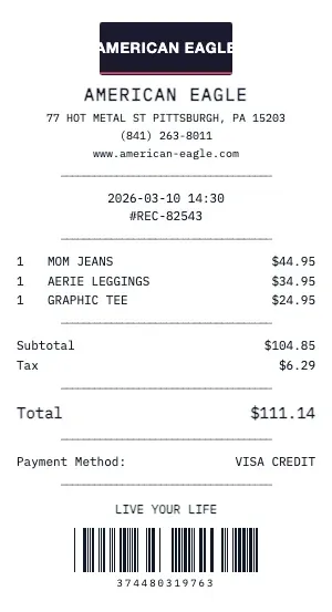 Whether you need a American Eagle receipt for a warranty claim, return authorization, price adjustment, or expense documentation, our generator creates receipts that look exactly like the real thing. Customize store number, register number, transaction ID, and barcode.