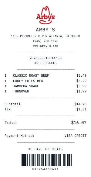 Submit per diem or actual expense claims for dining at Arby's during business trips. Our receipts include all the details your finance team needs: date, time, location, and itemized charges.