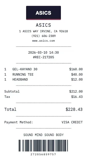 Whether you need a Asics receipt for a warranty claim, return authorization, price adjustment, or expense documentation, our generator creates receipts that look exactly like the real thing. Customize store number, register number, transaction ID, and barcode.