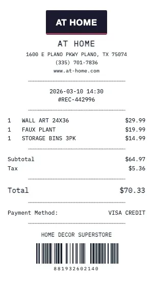 Whether you need a At Home receipt for a warranty claim, return authorization, price adjustment, or expense documentation, our generator creates receipts that look exactly like the real thing. Customize store number, register number, transaction ID, and barcode.