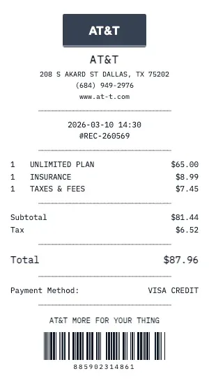 Whether you need a AT&T receipt for a warranty claim, return authorization, price adjustment, or expense documentation, our generator creates receipts that look exactly like the real thing. Customize store number, register number, transaction ID, and barcode.