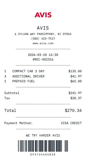 Whether you need a Avis receipt for a warranty claim, return authorization, price adjustment, or expense documentation, our generator creates receipts that look exactly like the real thing. Customize store number, register number, transaction ID, and barcode.