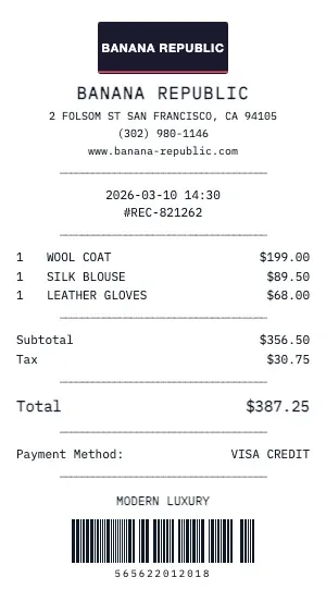 Whether you need a Banana Republic receipt for a warranty claim, return authorization, price adjustment, or expense documentation, our generator creates receipts that look exactly like the real thing. Customize store number, register number, transaction ID, and barcode.