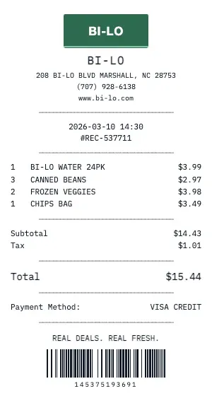 Generate a realistic Bi-Lo grocery receipt with our free tool. Our grocery receipt format includes department codes, item SKUs, weight-based pricing for produce and deli, coupon discounts, loyalty card savings, and the classic "YOU SAVED $X.XX" summary line that real grocery receipts feature.