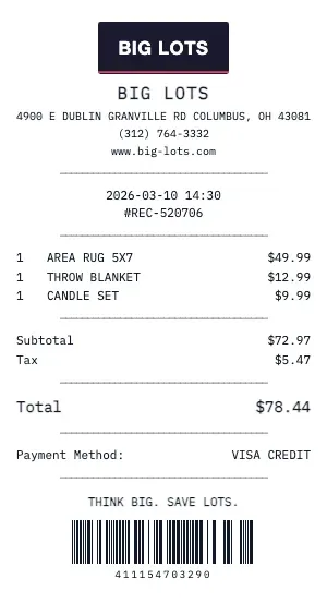 Whether you need a Big Lots receipt for a warranty claim, return authorization, price adjustment, or expense documentation, our generator creates receipts that look exactly like the real thing. Customize store number, register number, transaction ID, and barcode.