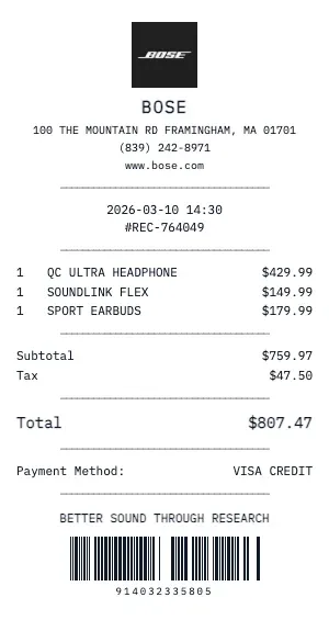 Our Bose template handles electronics-specific transactions: trade-in credit applied, carrier activation fees, monthly installment plan details, screen protector and case add-ons, and recycling fee charges. The perfect tool for documenting tech purchases and protecting your investment.