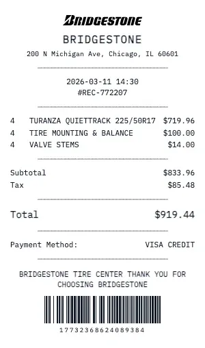 Whether you need a Bridgestone receipt for warranty claims, insurance documentation, resale value records, or fleet maintenance logs, our generator handles it. Add technician name, service bay number, work order number, and recommended future services with mileage intervals.