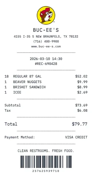 Buc-ee's gas receipts from our tool feature the specific formatting used by fuel station POS systems: transaction ID, pump authorization number, fuel type selection, volume dispensed, unit price, and payment method. You can add inside purchases (snacks, drinks, lottery) as separate line items.
