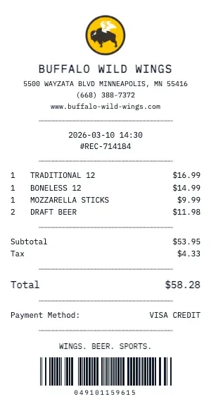 Every detail matters. Here\u2019s what a genuine Buffalo Wild Wings receipt includes \u2014 and how our generator replicates each element.