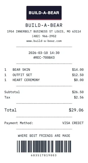 Whether you need a Build-A-Bear receipt for a warranty claim, return authorization, price adjustment, or expense documentation, our generator creates receipts that look exactly like the real thing. Customize store number, register number, transaction ID, and barcode.
