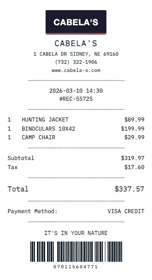 Whether you need a Cabela's receipt for a warranty claim, return authorization, price adjustment, or expense documentation, our generator creates receipts that look exactly like the real thing. Customize store number, register number, transaction ID, and barcode.