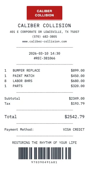 Maintain a complete Caliber Collision service record for your vehicle. Our receipt includes VIN, mileage, services performed, and parts used — essential for resale value and warranty compliance.