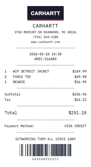 Create a professional Carhartt retail receipt with our free generator. Our retail receipt format includes item descriptions, SKU/UPC numbers, sizing information, color variants, original vs. sale pricing, and return policy details — matching the format of major retail POS systems.