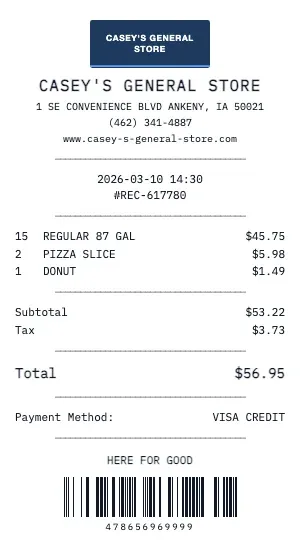Create a realistic Casey's General Store gas station receipt for fuel purchases, car washes, or convenience store items. Our generator includes pump number, fuel grade (Regular, Plus, Premium, Diesel), gallons dispensed, price per gallon, and total cost — exactly like a real fuel receipt.