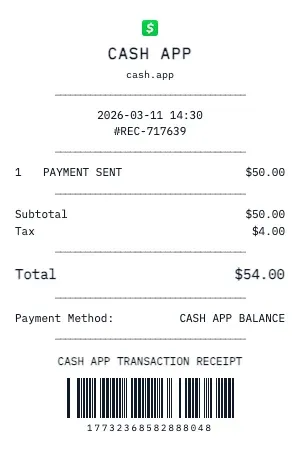 Whether you need a Cash App receipt for a warranty claim, return authorization, price adjustment, or expense documentation, our generator creates receipts that look exactly like the real thing. Customize store number, register number, transaction ID, and barcode.