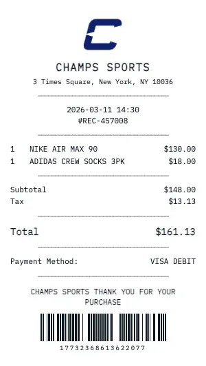 Whether you need a Champs Sports receipt for a warranty claim, return authorization, price adjustment, or expense documentation, our generator creates receipts that look exactly like the real thing. Customize store number, register number, transaction ID, and barcode.