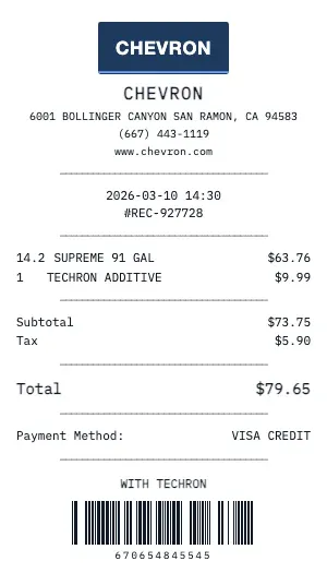 Track fuel costs from Chevron for IRS-standard mileage deduction or employer mileage reimbursement programs. Our receipts show gallons, price, and location for audit-ready records.