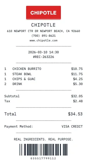 Need a Chipotle restaurant receipt? Our generator creates authentic dining receipts complete with itemized food and beverage orders, server name, table number, tip line, and gratuity calculations. Whether you're documenting a business dinner or replacing a faded receipt, ProReceiptMaker delivers the most realistic Chipotle receipt available online.