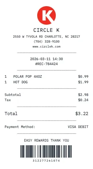 Whether you need a Circle K receipt for a warranty claim, return authorization, price adjustment, or expense documentation, our generator creates receipts that look exactly like the real thing. Customize store number, register number, transaction ID, and barcode.