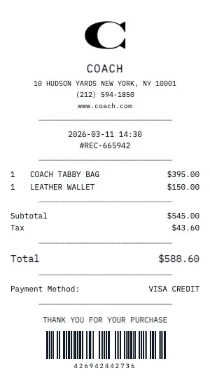 Whether you need a Coach receipt for insurance appraisal, resale authentication, gift documentation, or personal collection records, our generator produces receipts with the attention to detail that luxury brands are known for. Add care instructions, warranty terms, and boutique contact information.