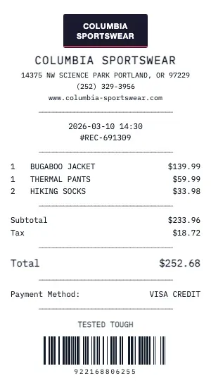 Whether you need a Columbia Sportswear receipt for a warranty claim, return authorization, price adjustment, or expense documentation, our generator creates receipts that look exactly like the real thing. Customize store number, register number, transaction ID, and barcode.