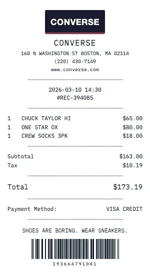 Create a professional Converse retail receipt with our free generator. Our retail receipt format includes item descriptions, SKU/UPC numbers, sizing information, color variants, original vs. sale pricing, and return policy details — matching the format of major retail POS systems.