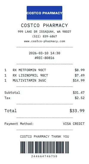 The Costco Pharmacy receipt format handles medical-specific billing: CPT codes, ICD-10 diagnosis references, insurance plan payments, patient responsibility amounts, deductible tracking, and payment plan options. Essential for FSA/HSA reimbursement and tax deduction documentation.