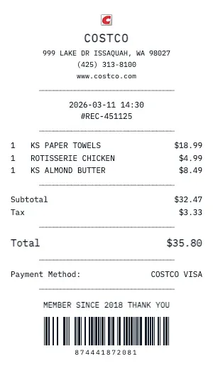 Costco receipts are easy to spot: the wide thermal paper, the Kirkland Signature item names, the bolded savings total, and the prominent member ID. Our template captures every detail.