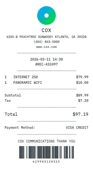 Need documentation for a Cox return? Generate a receipt with the correct return policy dates, original payment method, and item condition notes.