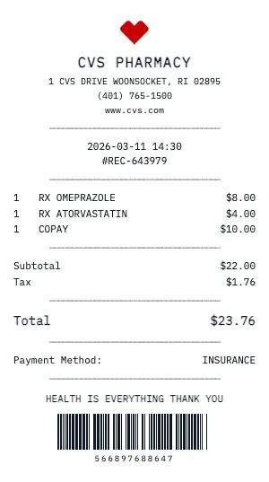Whether you need a CVS Pharmacy receipt for a doctor visit, dental procedure, vision exam, or prescription pickup, our generator creates compliant-looking receipts. Add provider NPI numbers, facility addresses, and service date ranges.