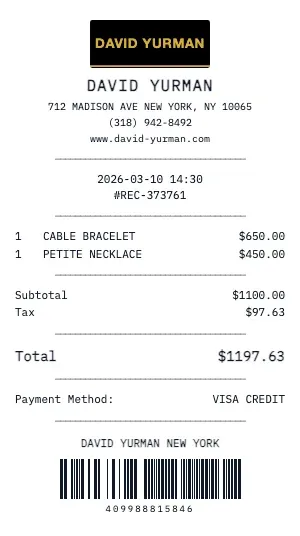 Whether you need a David Yurman receipt for insurance appraisal, resale authentication, gift documentation, or personal collection records, our generator produces receipts with the attention to detail that luxury brands are known for. Add care instructions, warranty terms, and boutique contact information.