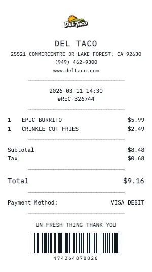 Need a Del Taco restaurant receipt? Our generator creates authentic dining receipts complete with itemized food and beverage orders, server name, table number, tip line, and gratuity calculations. Whether you're documenting a business dinner or replacing a faded receipt, ProReceiptMaker delivers the most realistic Del Taco receipt available online.