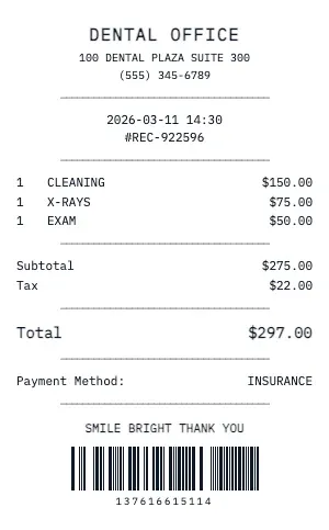 The Dental Office receipt format handles medical-specific billing: CPT codes, ICD-10 diagnosis references, insurance plan payments, patient responsibility amounts, deductible tracking, and payment plan options. Essential for FSA/HSA reimbursement and tax deduction documentation.