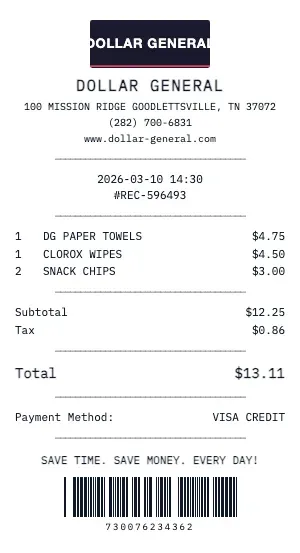 Generate a professional Dollar General retail receipt in seconds. Customize product names, prices, quantities, discounts, and payment details. Perfect for expense tracking, returns documentation, and record-keeping.
