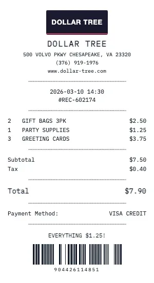 Whether you need a Dollar Tree receipt for a warranty claim, return authorization, price adjustment, or expense documentation, our generator creates receipts that look exactly like the real thing. Customize store number, register number, transaction ID, and barcode.