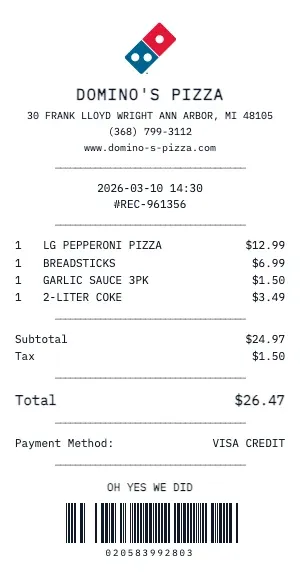 Every Domino's Pizza receipt from our tool includes the details diners expect — appetizers, entrées, drinks, desserts, subtotal, tax, tip amount, and total. You can customize the server name, table number, and even add a "Thank You" footer message. Our restaurant receipt format matches what real POS systems like Toast, Square, and Clover produce.