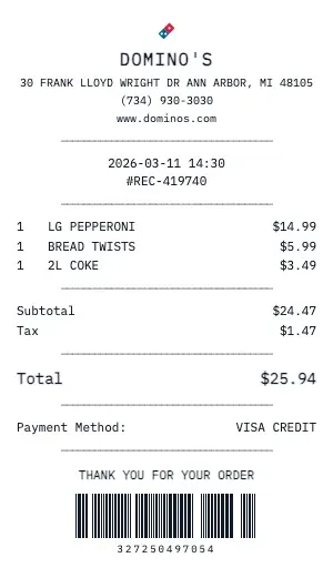 Every Domino's receipt from our tool includes the details diners expect — appetizers, entrées, drinks, desserts, subtotal, tax, tip amount, and total. You can customize the server name, table number, and even add a "Thank You" footer message. Our restaurant receipt format matches what real POS systems like Toast, Square, and Clover produce.