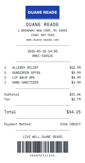 Whether you need a Duane Reade receipt for a doctor visit, dental procedure, vision exam, or prescription pickup, our generator creates compliant-looking receipts. Add provider NPI numbers, facility addresses, and service date ranges.
