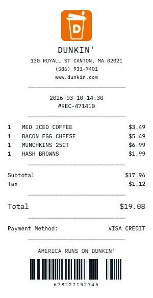 Track your daily Dunkin' habit to understand the true cost. Generate receipts showing your regular orders — that $6 oat milk latte adds up to $2,190/year!