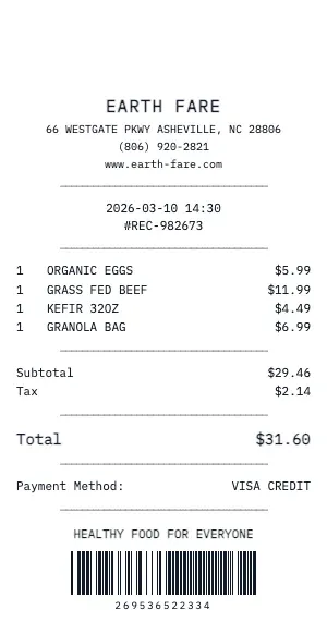 Building a price comparison database? Generate standardized Earth Fare receipts to track and compare product prices across stores, dates, and promotions.