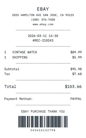 Whether you need a eBay receipt for a warranty claim, return authorization, price adjustment, or expense documentation, our generator creates receipts that look exactly like the real thing. Customize store number, register number, transaction ID, and barcode.