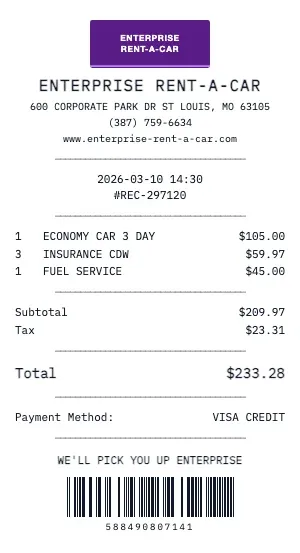 Every detail matters. Here\u2019s what a genuine Enterprise Rent-A-Car receipt includes \u2014 and how our generator replicates each element.