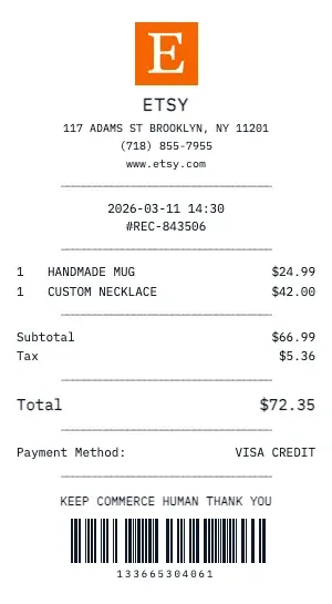 Whether you need a Etsy receipt for a warranty claim, return authorization, price adjustment, or expense documentation, our generator creates receipts that look exactly like the real thing. Customize store number, register number, transaction ID, and barcode.