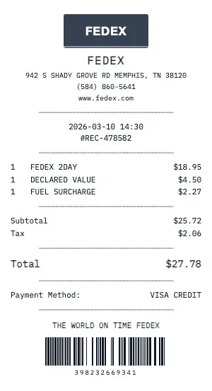 Whether you need a FedEx receipt for a warranty claim, return authorization, price adjustment, or expense documentation, our generator creates receipts that look exactly like the real thing. Customize store number, register number, transaction ID, and barcode.