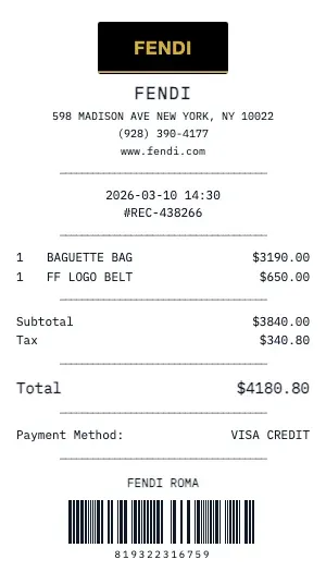 Whether you need a Fendi receipt for insurance appraisal, resale authentication, gift documentation, or personal collection records, our generator produces receipts with the attention to detail that luxury brands are known for. Add care instructions, warranty terms, and boutique contact information.